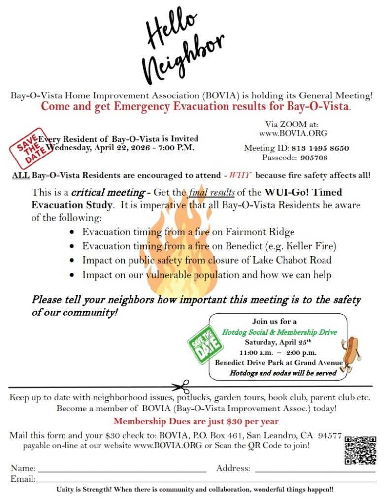 Our next meeting will be at APRIL 22, 2026 at 7:00 p.m.  An important presentation will be made by the WUI-Go! Team regarding their Final Evacuation Timed Study Results for Bay-O-Vista.  Please do not miss it as emergency evacuation is critical to us all!