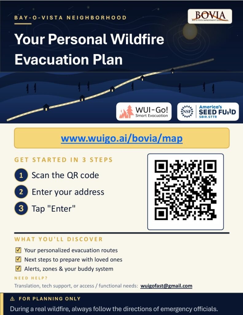 The WUI-Go! Evacuation Tool is an individualized, interactive planning tool to help you prepare for an emergency evacuation due to wildfire. It is the most important safety tool we are offering every Bay-O-Vista resident at no-cost. The BOVIA Board believes our overall safety is paramount given the topography of Bay-O-Vista with limited exit routes, and our high fire risk danger due to adjacent regional parks.