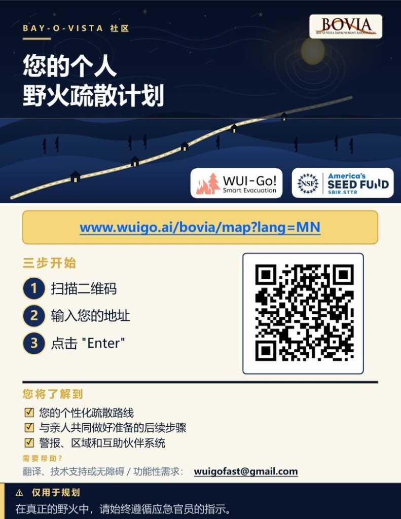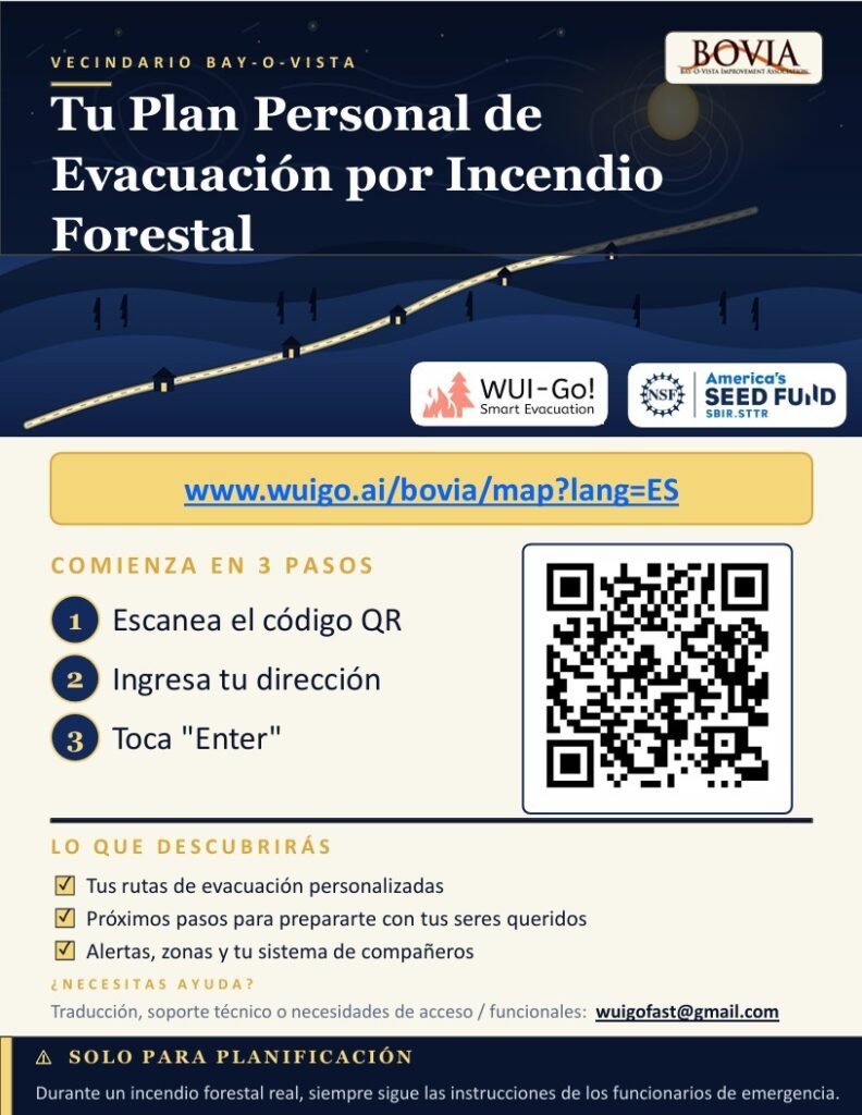 Several presentations (Zoom and in-person) have been conducted to help educate residents on the WUI-GO! developers, the Tool and the criticality for Bay-O-Vista residents. In mid-February, an enclosure with QR Codes (in three different languages to accommodate as many of our Bay-O-Vista residences as possible) was mailed to all Bay-O-Vista residents along with our annual 2026 Membership Dues letter.
